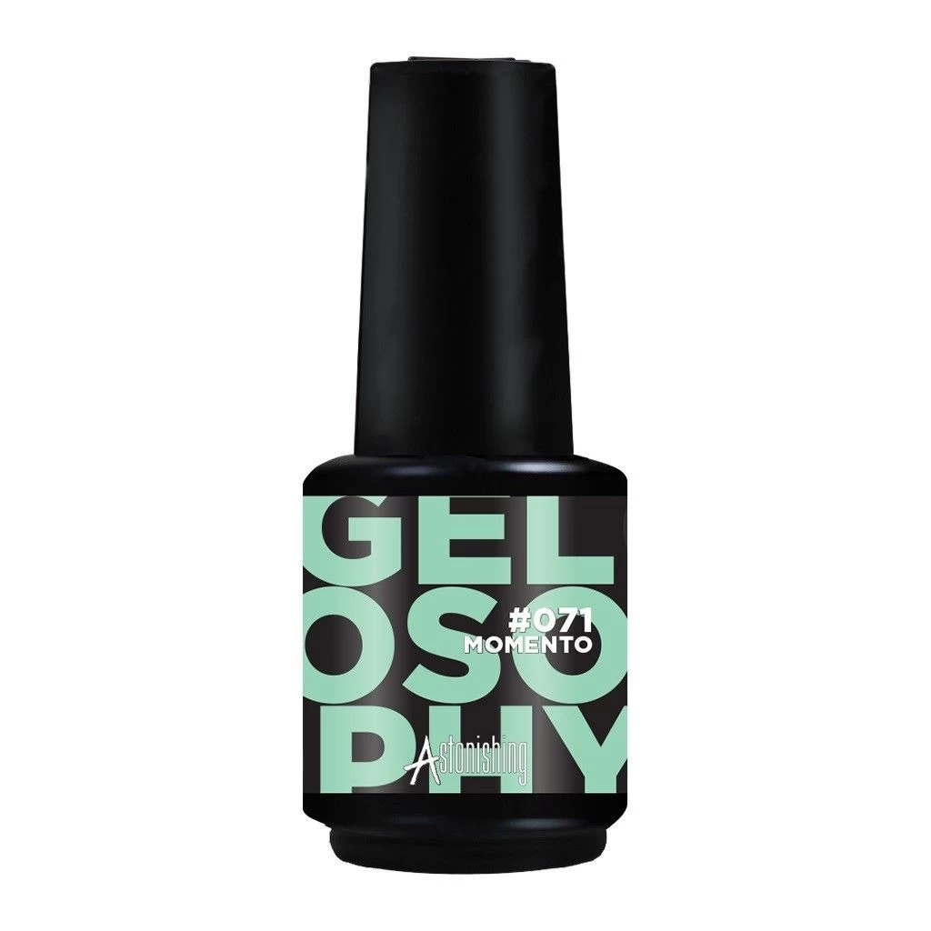 De Astonishing Gelosophy 071 Momento 15ml is een speciaal geformuleerde UV / LED nagellak. Het geeft de nagels niet alleen een prachtige kleur maar ook een stralende glans. Astonishing biedt trendy en moderne kleuren die ongeveer 4 weken mooi blijven. Deze gel polish heeft een nieuwe verbeterde formule die eenvoudiger is aan te brengen door de perfect viscositeit. De Astonishing Gelosophy is hoog gepigmenteerd waardoor een dunne laag al voldoende is. Dankzij de speciaal ontworpen grip op de dop kan de gel polish eenvoudig en professioneel worden aangebracht. De Astonishing Gelosophy is een afweekbare gel polish die binnen 8 á 10 minuten af te weken is.