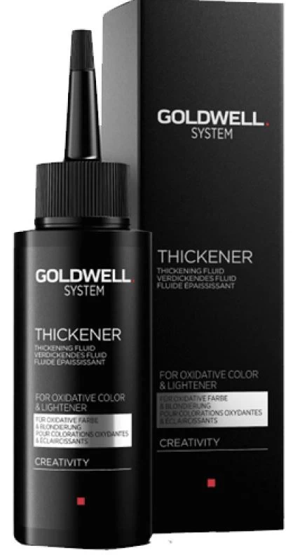 De Goldwell Thickener 100ml is een geconcentreerde verdikkende fluid. Deze Thickener zorgt ervoor dat de samenstelling van oxidatieve kleuring en blondering verdikt wordt. De Goldwell Thickener werkt niet met Elumen, maar past wel gemakkelijk de consistentie van de blondering en kleuringen aan. Wij raden het aan de Goldwell Thickener te gebruiken in combinatie met de haarverf van Goldwell.