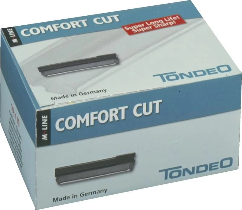 Tondeo Solingen staat al jaren bekend als leverancier van kwalitatief hoogwaardige kappersscharen, scheermessen en andere professionele kappersartikelen. De Tondeo Comfort Cut Klingen beschikken over een geoptimaliseerde snijgeometrie voor een extra lange levensduur en scherpte. De scheermesjes zijn gemaakt van roestvrij, gehard staal. Met een teflon platinum chroom nitride coating glijden de mesjes als boter over de huid. Het snijvlak heeft een lengte van 50 mm. Deze verpakking scheermesjes bevat 10 x 10 mesjes.